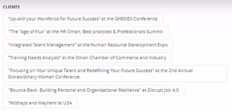 It could be woven into the bio so to say someone who's experienced and seen a lot, having traveled to 20 countries and having the craziest of experiences, sometimes with very difficult moments, has developed a resilience that she can share with you, so you and your team or the audience will come away with 3 ways to improve their lives the next day.