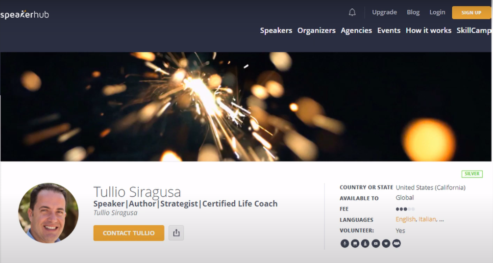 In this particular case with Tullio's profile page, I don't see that. It's an abstract image or perhaps some sparklers or something like that, but it's not showcasing him as a speaker.