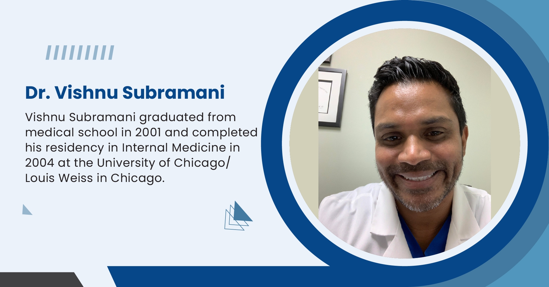 Emerging as a luminary within the healthcare domain, Dr. Vishnu Subramani's journey commenced in the vibrant community of Evanston, IL. Following graduating from medical school in 2001, he further solidified his commitment to medicine by completing a residency in internal medicine at the University of Chicago/Louis Weiss Hospital in 2004. During this foundational period, he honed his expertise and deeply ingrained in him a dedication to advancing patient care, focusing on internal medicine and obesity treatment.