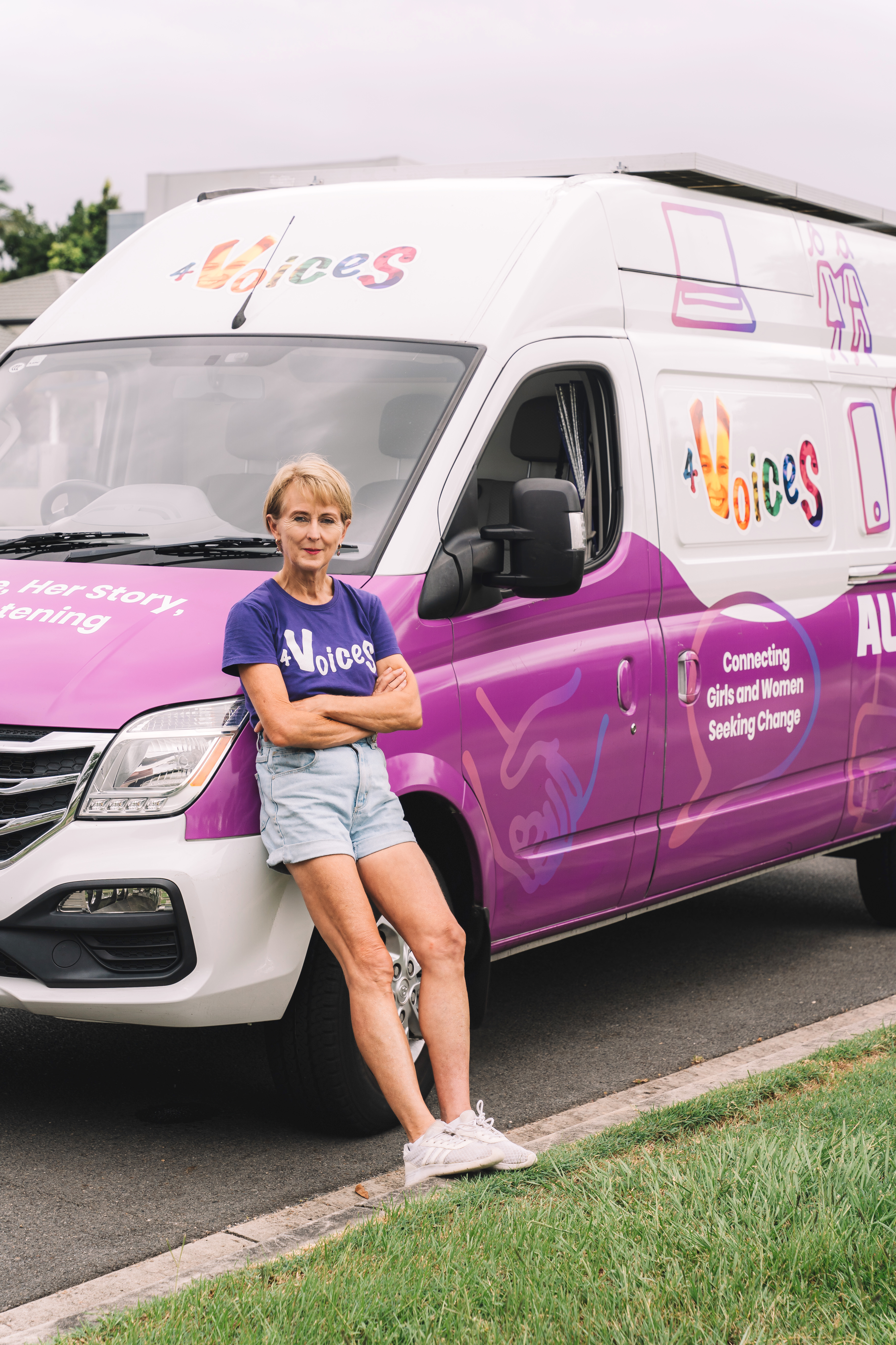 About 6 years ago Jo’s son and his best mate put two washing machines and two dryers into the back of their old van and started washing clothes for people who were homeless in Brisbane. They started an organisation called Orange Sky. They didn’t know too much about washing clothes so they talked to Jo about coming on board as CEO. Fast forward 7 years and Orange Sky now has 30 vans, 2000 volunteers all over Australia and NZ. Such an extraordinary achievement to help build such a wonderful charity, with her son and his best mate. Jo learned a lot about homelessness whilst at Orange Sky and the immense difference a conversation can make to a person who is marginalised by the majority of the community. Jo also discovered that most homeless women in Australia have fled a violent relationship. It was horrifying to learn that women would prefer to take their chances on the street rather than live in fear with an abusive partner. Her resolve to start 4 Voices deepened with this knowledge and her passion to help girls and women find their voice cemented. Jo and her team are determined to provide connection from the back of a cool-looking purple van which oozes welcome and acceptance. No connection is avoided, no issue too trivial, no referrals needed, no girl or woman turned away. 4 Voices has no customers, clients or patrons, only “partners” with whom it builds trusting relationships.