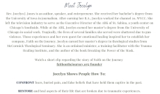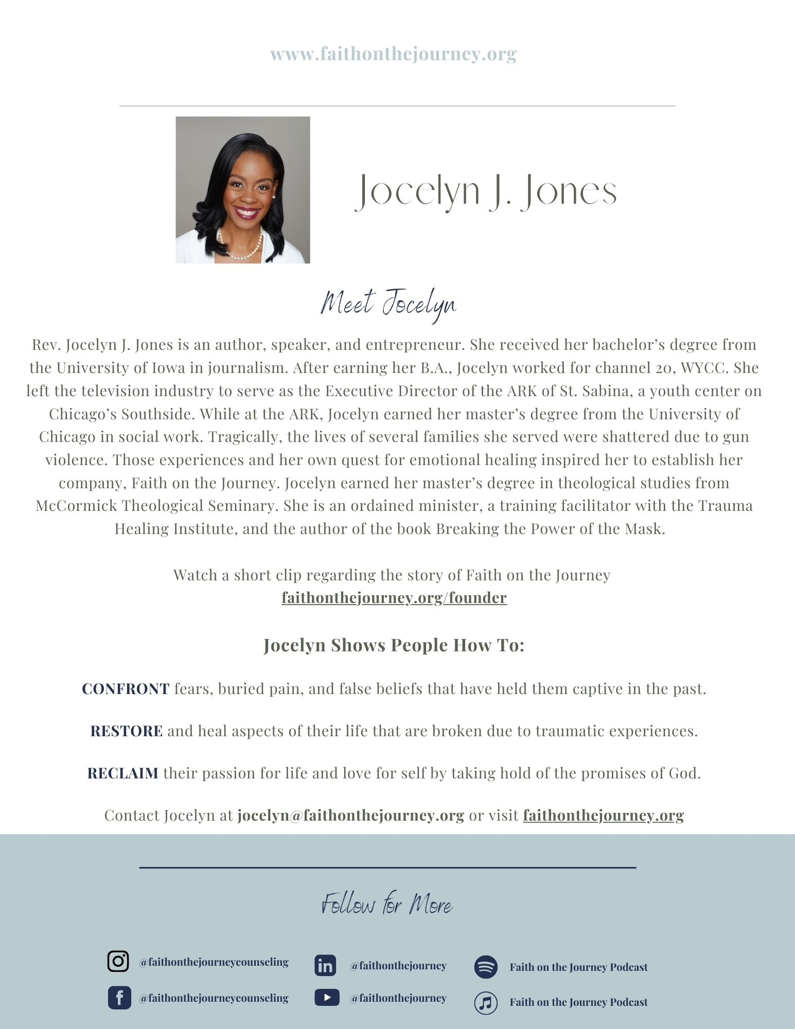 Jocelyn J. Jones is an author, speaker, and entrepreneur. After earning her B.A. in Journalism, Jocelyn worked for channel 20, WYCC. She left the television industry to serve as the Executive Director of a youth center on Chicago’s Southside. Tragically, the lives of several families she served were shattered due to gun violence. Those experiences and her quest for emotional healing inspired her to establish her counseling company, Faith on the Journey. She is an ordained minister, a training facilitator with the Trauma Healing Institute, and the author of the book Breaking the Power of the Mask.