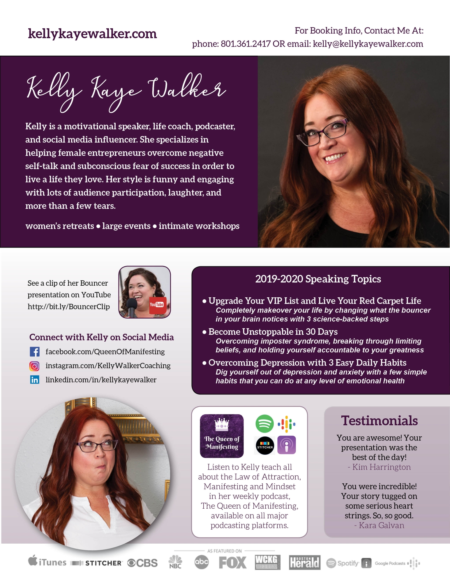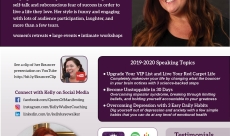Kelly is a motivational speaker, life coach, podcaster, cruise retreat host, and social media influencer. She specializes in helping female entrepreneurs overcome negative self-talk and subconscious fear of success in order to live a life they love. Her style is funny and engaging with lots of audience participation, laughter, and more than a few tears.