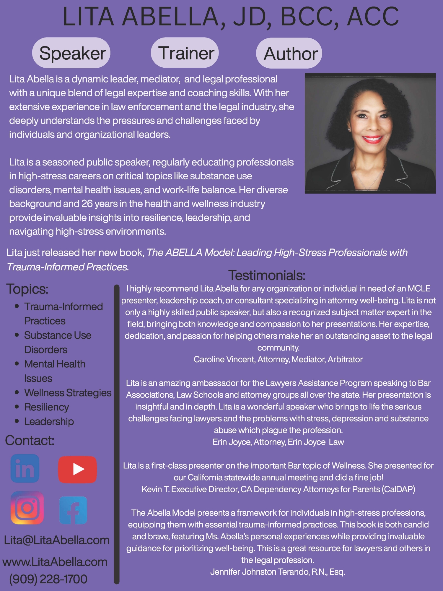Lita is also a seasoned public speaker, delivering educational presentations to professionals in high-stress careers on critical topics such as substance use disorders, mental health, and work-life balance. Her diverse background with the Los Angeles Police Department highlights her resilience, adaptability, and leadership under pressure. She understands the emotional toll that high-stress careers can take, particularly regarding post-traumatic stress, vicarious trauma, and compassion fatigue. She published her first book on these topics, The ABELLA Model: Leading High-Stress Professionals with Trauma-Informed Practices.