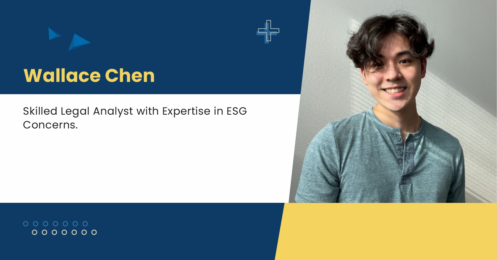 Born to Taiwanese parents, Chen has also worked extensively in legal data analytics, policy research, and corporate governance. In 2023, his year-long internship at DLA Piper Law offered valuable insight into environmental, social, and governance (ESG) initiatives. His team effectively advised multiple Fortune 500 clients and guided them through the relatively new and emerging field of corporate social responsibility. His work sharpened the firm's approach to risk management and enhanced its advisory capabilities. Aspiring to delve deeper into corporate litigation, he is focused on expanding his legal acumen post-graduation.